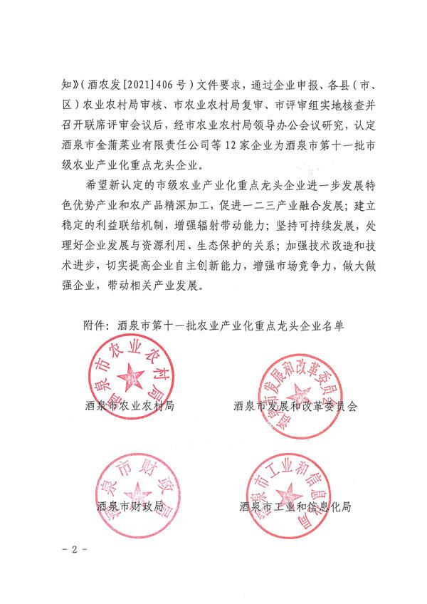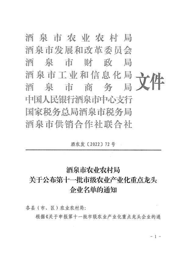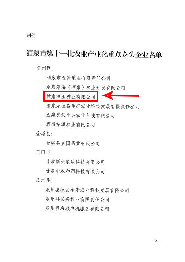 祝賀甘肅酒玉種業(yè)有限公司被認(rèn)定為酒泉市農(nóng)業(yè)產(chǎn)業(yè)化市級(jí)龍頭企業(yè)