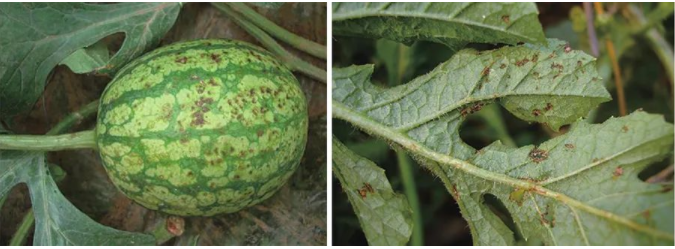 西瓜細(xì)菌性角斑病果實癥狀(左圖) ;西瓜細(xì)菌性角斑病葉部癥狀 (右圖)